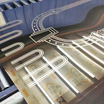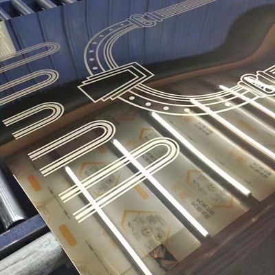 Geätzte Muster werden geschaffen, indem man selektiv einen schützenden säurebeständigen Film an festgesetzten Bereichen und an Ätzen die ungeschützten Bereiche aufträgt. Die Radierung entfernt eine Dünnschicht des Edelstahls, Wechsler die Farbe zu einem stumpfen silbernen Grau und rauht die Oberfläche auf, die zum Reiben, zum Superspiegel oder zu anderen Enden kontrastiert werden kann, zum von Tausenden Veränderungen zu schaffen. Geätztes Ende kann vor oder nach Radierung auch gefärbt werden. Es war für Dekorationsanwendungen, wie Aufzugstüren, Wände, Fertig werden und Ordnung weitverbreitet.