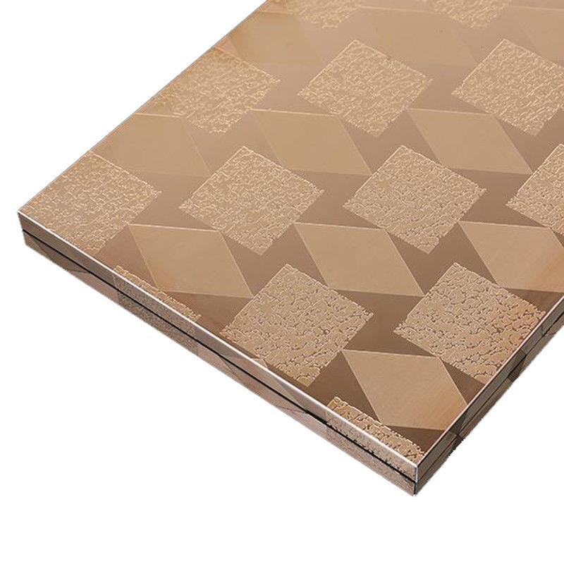 Die geätzten Muster entstehen durch selektives Auftragen einer schützenden, säurebeständigen Folie auf bestimmte Bereiche und durch Säure-Etischung der ungeschützten Bereiche.die Farbe in ein stumpfes silbernes Grau verändernDie Oberfläche kann mit Schleifen, Superspiegel oder anderen Oberflächen kontrastiert werden, um Tausende von Variationen zu erzeugen.Es wurde häufig für Dekorationen verwendet., wie z. B. Aufzugstüren, Wandplatten, Abdeckung und Ausstattung.